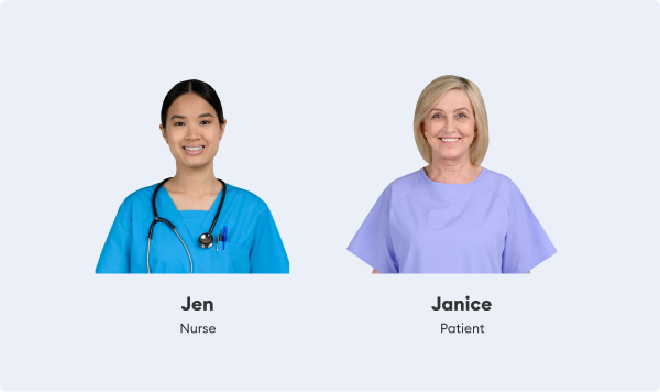 Janice est une femme joyeuse vêtue d’une chemise d’hôpital. Elle comporte une grande variété d’expressions et conviendra parfaitement aux soins aux patients et aux modules liés à la santé.