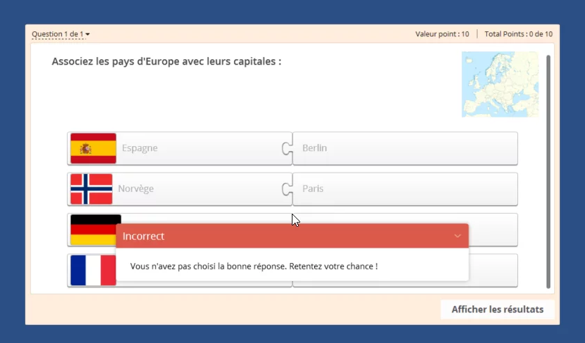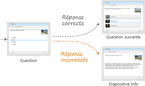 Il est également possible de créer des parcours personnalisés pour chaque quiz. Les résultats peuvent être différents pour chaque question ou choix réponse. Grâce à cette fonctionnalité, le formateur peut identifier les forces et les faiblesses de ses apprenants. Il peut donc soit les permettre de continuer le quiz soit de leur donner une explication de la bonne réponse.