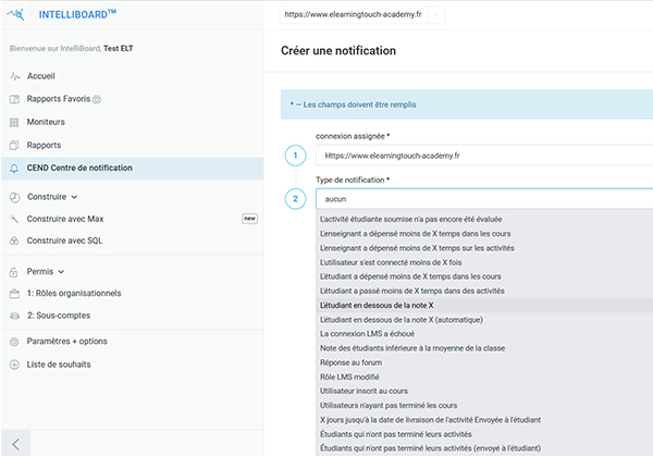 Nous vous aidons à paramétrer vos tableaux, rapports et notifications dans Intelliboard, en fonction de vos objectifs, pour qu’ils soient les plus pertinents possibles. Contactez-nous !