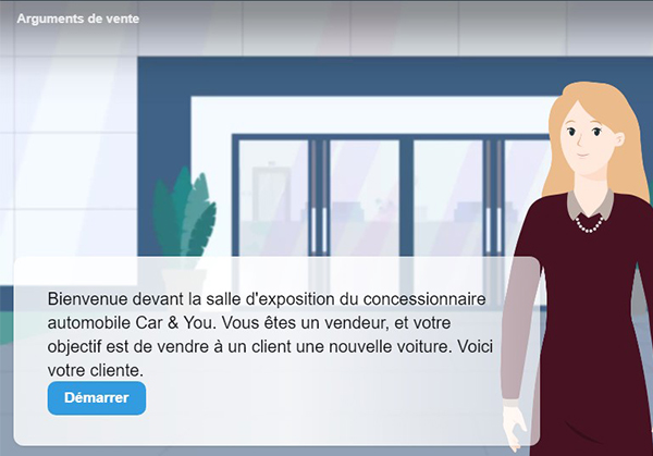 Les simulations de conversation bénéficient d’un nouveau look et de nouvelles animations. L’ambiance générale et la conception des dialogues sont modifiées. Les réponses des apprenants ne disparaissent plus comme avant, mais se déplacent vers le haut de l’écran. Cela permet aux apprenants de mieux suivre la progression de leur scénario de formation, et de voir comment les options de réponse qu’ils ont sélectionnées affectent le dialogue.
